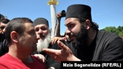Тысячи людей быстро прорвали кордоны патрульной полиции и устремились на прилегающую к площади Свободы территорию. Здесь агрессивно настроенные православные активисты рассчитывали расправиться с представителями ЛГБТ-движения. В бегущей толпе преобладал черный цвет, а развевающиеся на бегу рясы священнослужителей мелькали в авангарде нападающих. Люди здесь были самые разные – от школьного до пенсионного возраста. Пришли и последователи отстраненного от служения Басилия Мкалавишвили, который недавно отсидел срок за избиение членов христианских сект. Его сторонники планировали учить ЛГБТ-активистов "уму-разуму" пучками крапивы.