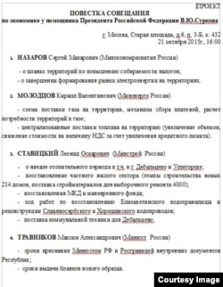 Проект повестки совещания в Администрации Президента России, которое должно было состояться 21 октября 2015 года: