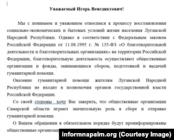 Нашлось во взломанной переписке место и самопровозглашенным "ДНР" и "ЛНР" (по большей части "народные республики" курировал сам Владислав Сурков). Вот, например, текст письма, который передала в администрацию президента помощница члена Совета Федерации России Сергея Мамедова. В нем ответ на просьбу главы "ЛНР" Игоря Плотницкого предоставить "молодой республике" гуманитарную помощь сообщает, что это "не входит в полномочия органов государственной власти Российской Федерации":