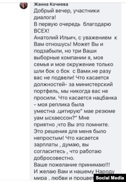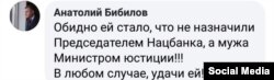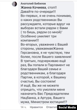 «Особенно умиляет "три компании"» (правописание сохранено), – продолжил гневную отповедь Анатолий Ильич. И во второй раз подтвердил, что Кочиева якобы умоляла назначить ее главой Нацбанка, а мужа – министром юстиции.