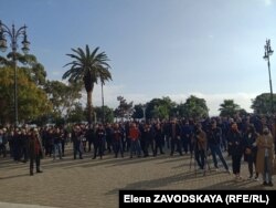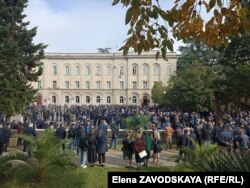 У здания Абхазского драматического театра начался митинг с требованием отставки министра внутренних дел самопровозглашенной республики Абхазия Дмитрия Дбар.