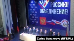 Во всю ширину и высоту сцены был растянут баннер, гласящий: «За Осетию! За Россию! За объединение!» Это слоган и дизайн предвыборной кампании Анатолия Бибилова. Хотя было анонсировано участие всех президентов Южной Осетии, первый – Людвиг Чибиров, и третий – Леонид Тибилов, не смогли присутствовать, но от их имени зачитали письма с уверениями безоговорочной поддержки инициативы.