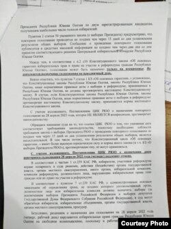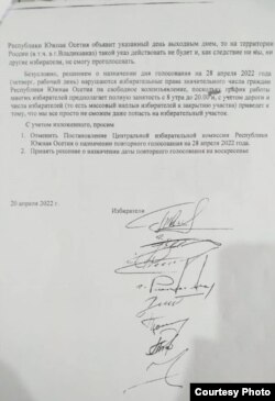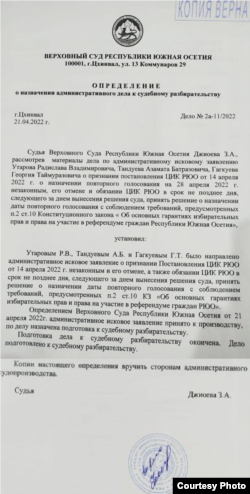 20 апреля трое граждан Южной Осетии – Утаров Радислав, Тандуев Азамат и Гагкуев Георгий обжаловали в Верховном суде постановление ЦИК РЮО о назначении повторного голосования на выборах президента как незаконное и нарушающее их избирательные права.