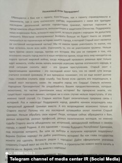 «Старый мост с прилегающими зданиями – последний оплот того, что по своей сути всегда считалось основой Цхинвала. И все прекрасно понимают, что он еще может долгие годы спокойно служить свою службу. Тем более если сделать его пешеходным, а новый мост построить ниже. Не лишайте города его сердца! Станьте истинно Народным Президентом! Не уподобляйтесь вашим предшественникам, которые по частям уничтожали нашу историю! Вы прекрасно знаете, что есть «красные линии», которые ни в коем случае нельзя переступать. И это именно такой случай. Со Старым мостом будет окончательно прервана связь с историей. Раз и навсегда! Поддержите народ, давайте начнем возрождать наш прекрасный древний Цхинвал вместе. А его возрождение возможно только со Старого моста! Потому что это последний оплот понятия «старый Цхинвал». Нельзя обрубать свои корни!»