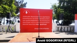 Ночью в Сухуме прошел сильный дождь, но уже к полудню в городе палило солнце. Поэтому организаторы митинга решили перенести баннер с цитатой Владислава Ардзинба, на фоне которого планировались выступления, и деревянный настил с микрофоном от здания театра поближе к комплексу правительственных зданий – туда, где гуще тень деревьев.