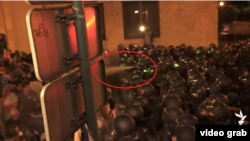 На улице Чичинадзе, у бокового входа в парламент, пустили перцовый спрей. Участников акции робокопы начали оттеснять от выходов в здание, таким образом пытаясь освободить место для того, чтобы депутаты правящей партии могли выехать на своих автомобилях.