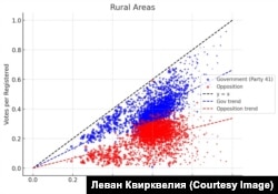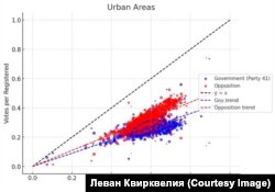 – С вашего позволения я перейду к следующим графикам, которые привлекли внимание многих – это голосование в городе и в сельской местности. У вас там такие интересные точки, которые следуют за прямыми. Какова специфика здесь?